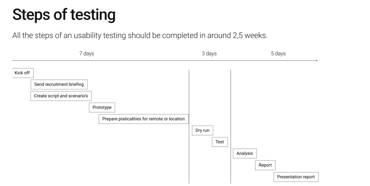 Here is an example of how to plan your next user interview. Depending on the number of interviews and the difficulty in recruitment, we estimate planning around 2,5 weeks. Look at the planning example to ensure you don’t overlook any steps.